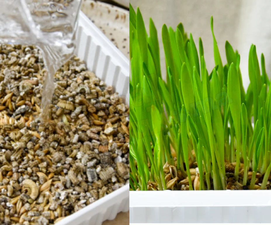 Avec des graines d’herbe d’orge naturelles issues de cultures contrôlées.